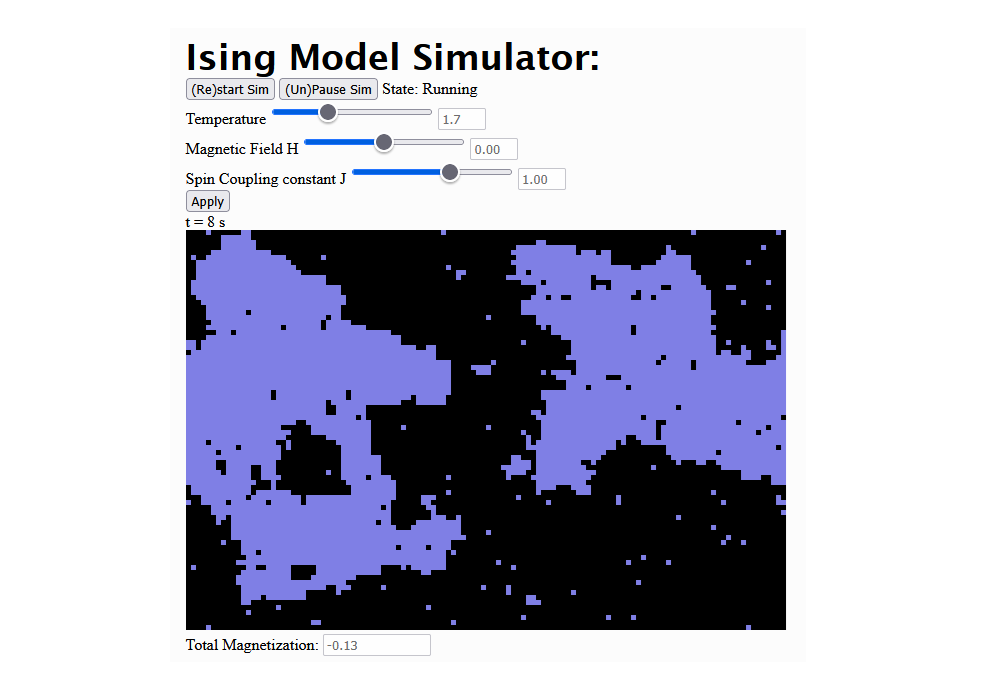 Hieronder heb ik in mijn playground een simulatie lopen waarin je de temperatuur T, de sterkte van een extern magnetisch veld H, en de spin-koppelingsconstante J kunt aanpassen.